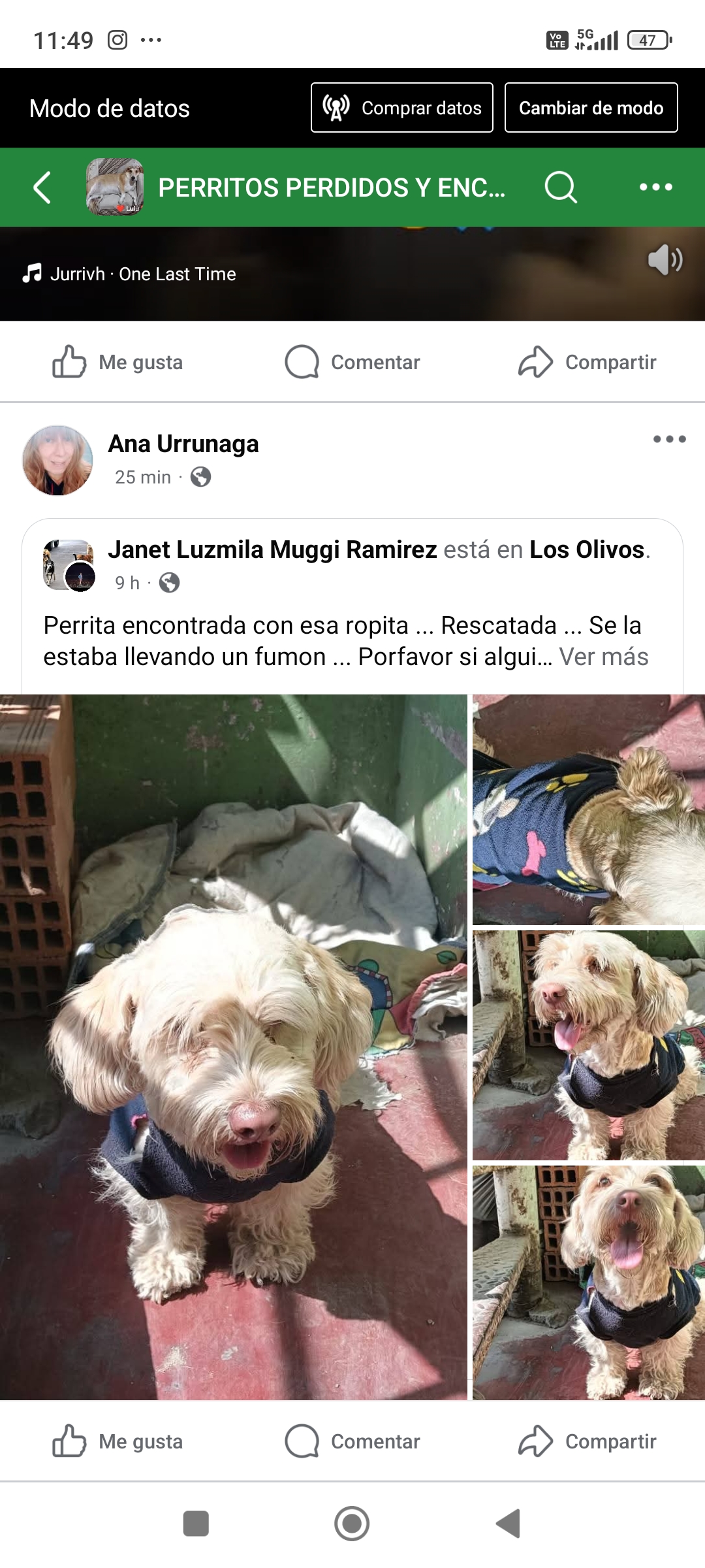 Perrita encontrada con esa ropita … Rescatada … Se la estaba llevando un fumon … Porfavor si alguien la reconoce me escribe … Encontrada en Av huandoy con central.. los olivos.. frente piza Raul