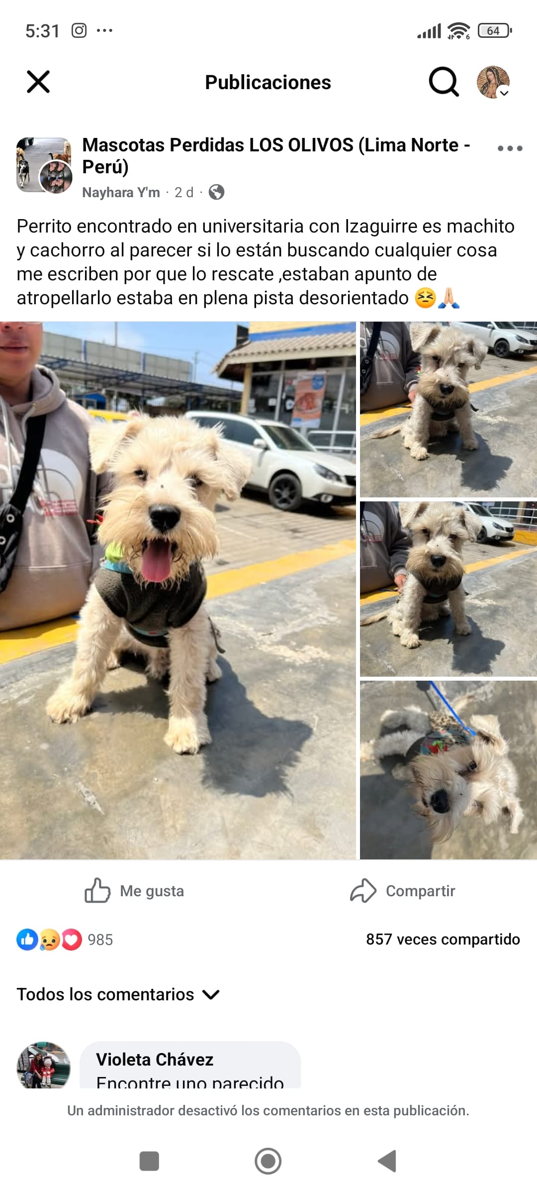 Perro encontrado en Universitaria con Izaguirre, de adjunta foto de quien lo tiene
