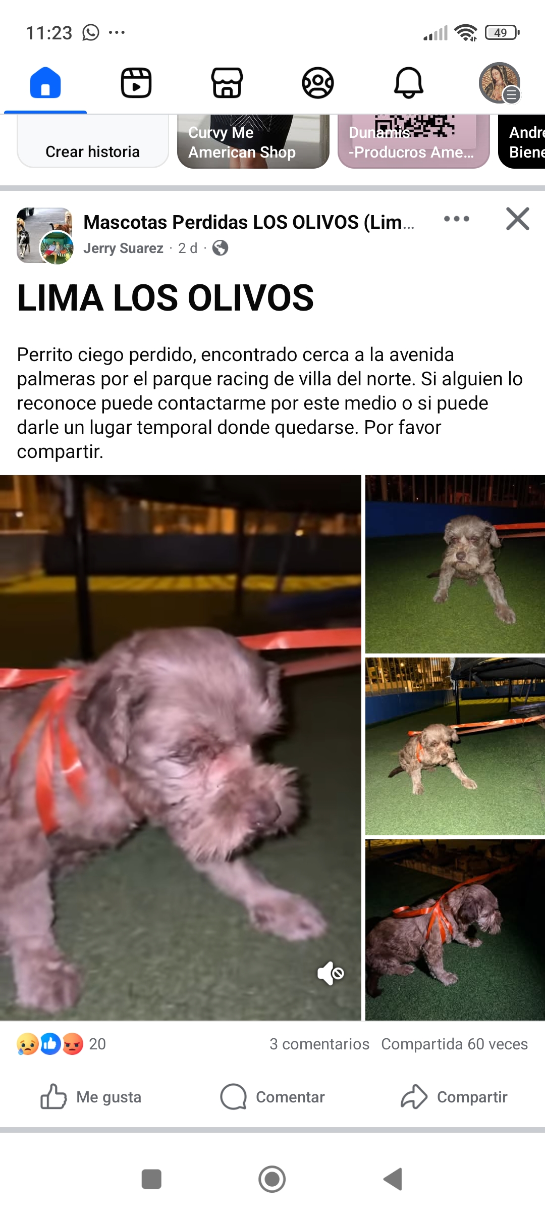 Perrito ciego perdido, encontrado cerca a la avenida palmeras por el parque racing de villa del norte. Si alguien lo reconoce puede contactarme por este medio o si puede darle un lugar temporal donde quedarse. Por favor compartir.