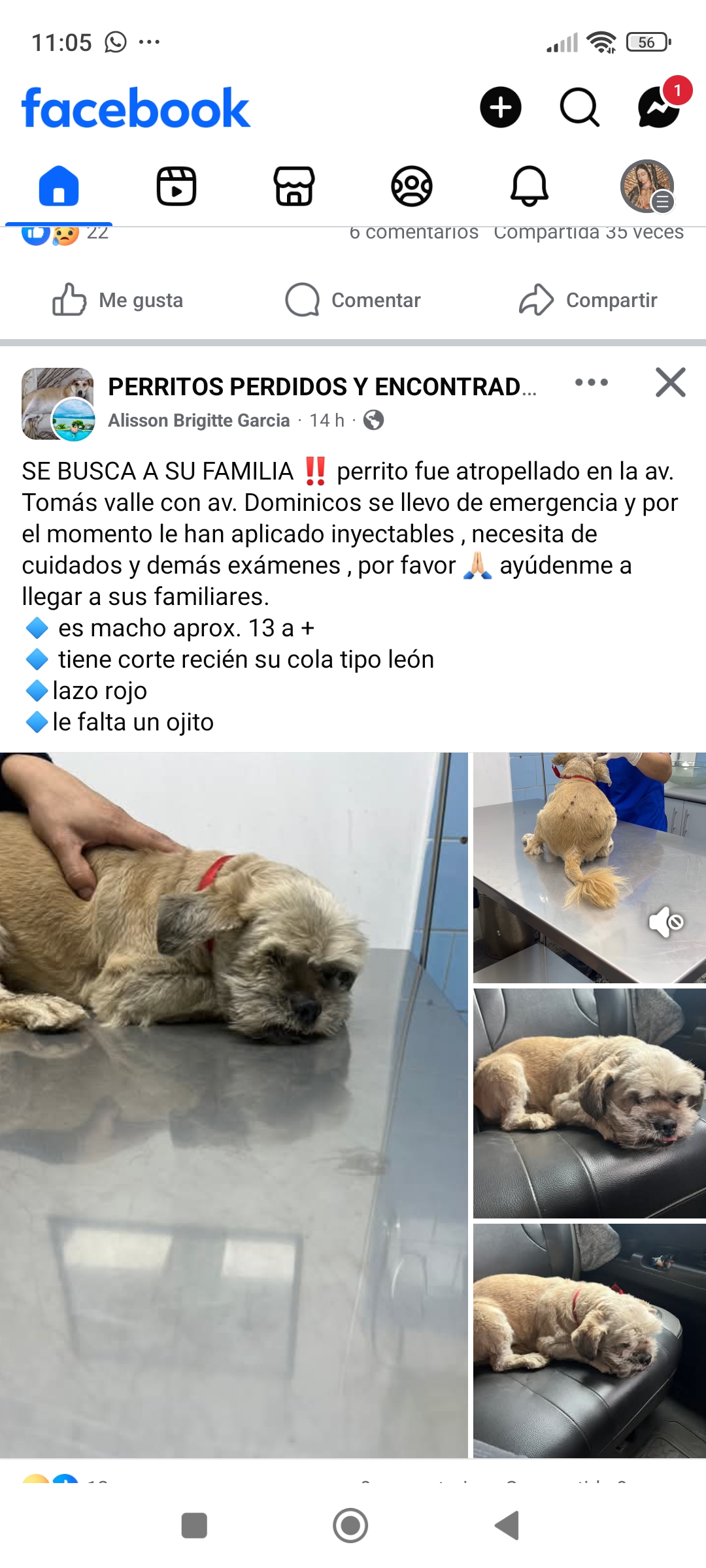 SE BUSCA A SU FAMILIA ‼️ perrito fue atropellado en la av. Tomás valle con av. Dominicos se llevo de emergencia y por el momento le han aplicado inyectables , necesita de cuidados y demás exámenes , por favor 🙏🏻 ayúdenme a llegar a sus familiares.