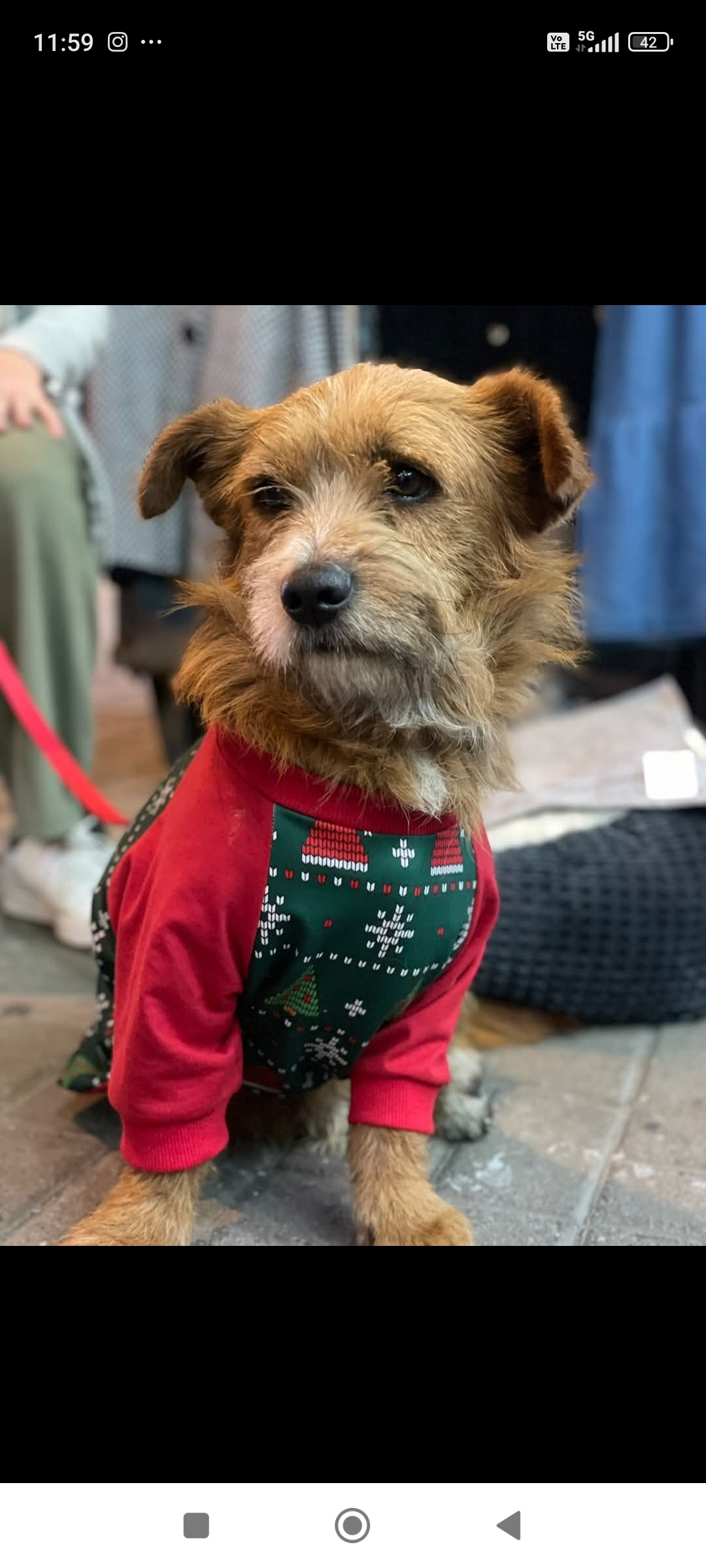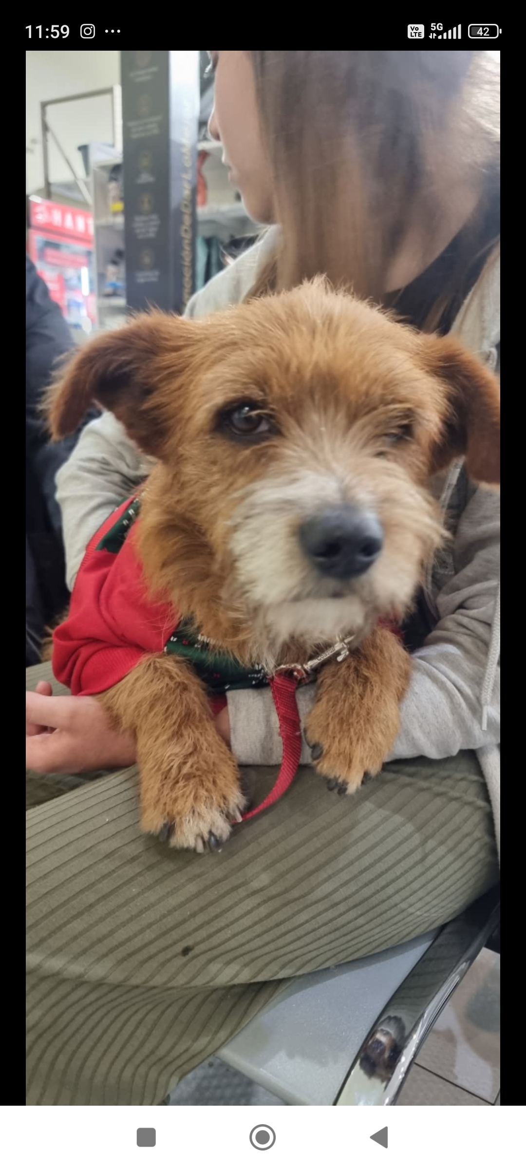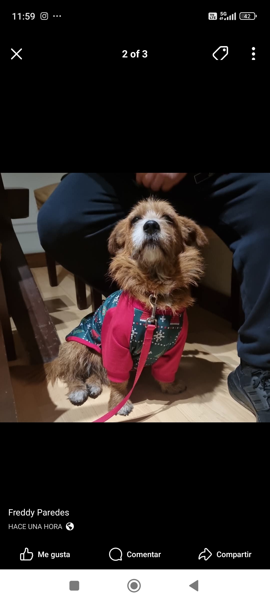 El dia de ayer aprox a las 8pm rescatamos este enano por la Rambla de San Borja. Le estamos dando temporal y lo llevaremos al veterinario hoy 19 de Nov para hacerle un chequeo general. Por favor… Les pido de todo corazon… si alguien sabe de su familia o le quiere dar un hogar para siempre, hacerlo feliz y tener un angelito en sus vidas… Comuniquense conmigo al 982704700. Es super tranquilo, educado y super cariñoso! Mil gracias a todos! La ropita que tenia era camuflada y con un cartel… y una señora le compró este nuevo navideño